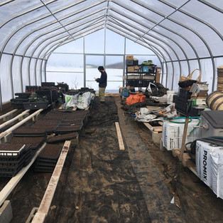 Our greenhouse setup has been delayed from where we had hoped to be (starting seeds March 1st) but we are just waiting one more week until full furnace hook up. In the meantime, organizing pots and trays, building moveable tables and filling trays with soil for our first successions have all been comfortable tasks on sunny days when the greenhouse warms up nicely. Our heated seedling greenhouse has been the biggest (and most expensive) infrastructure to go up on our new property. After seedling season, we plan to grow crops in the ground in here (hence the moveable tables) - including a trial of ginger and turmeric. For greenhouse tomatoes, we've started our seeds indoors already, planning on an early crop of cherry tomatoes.